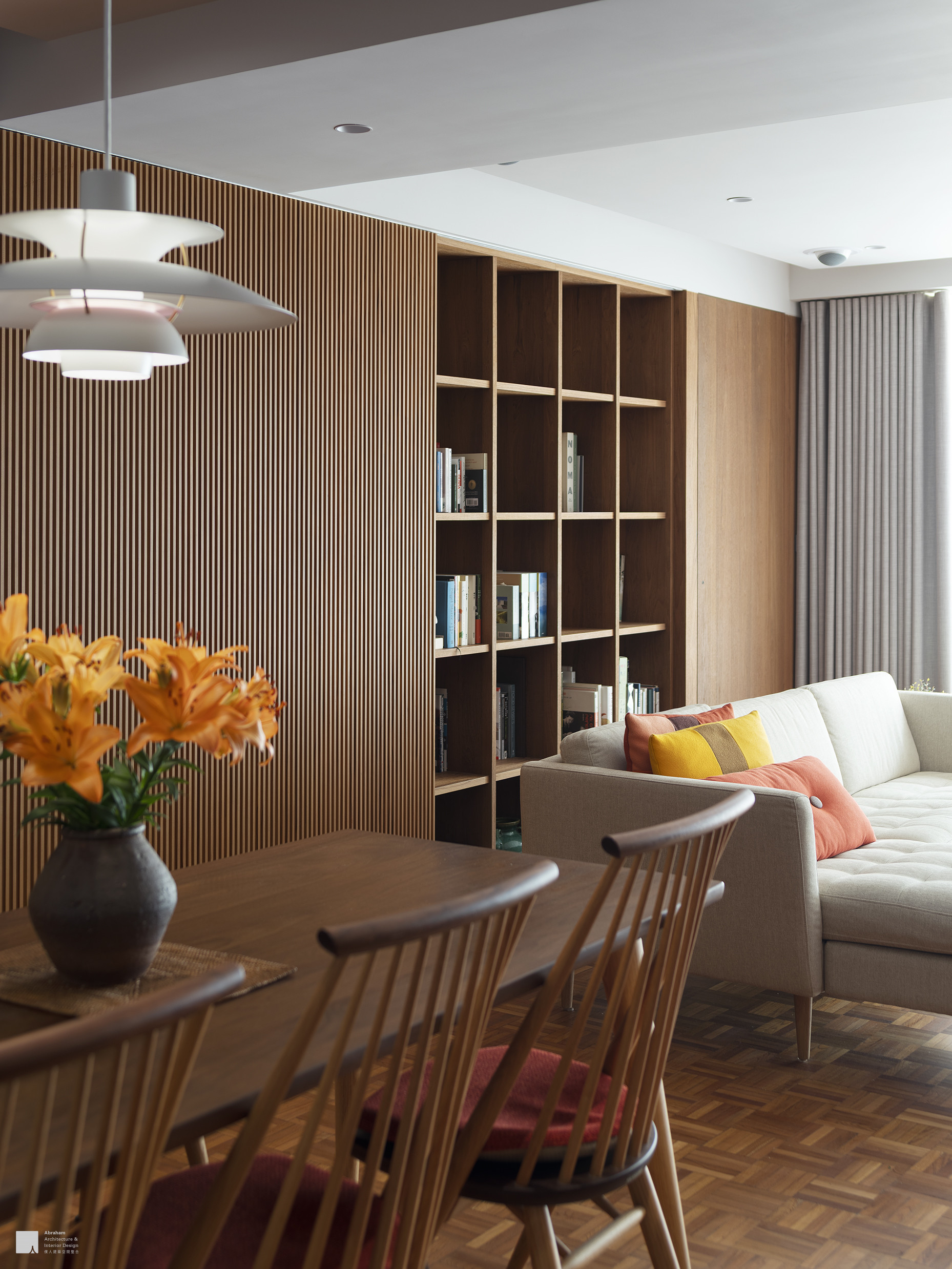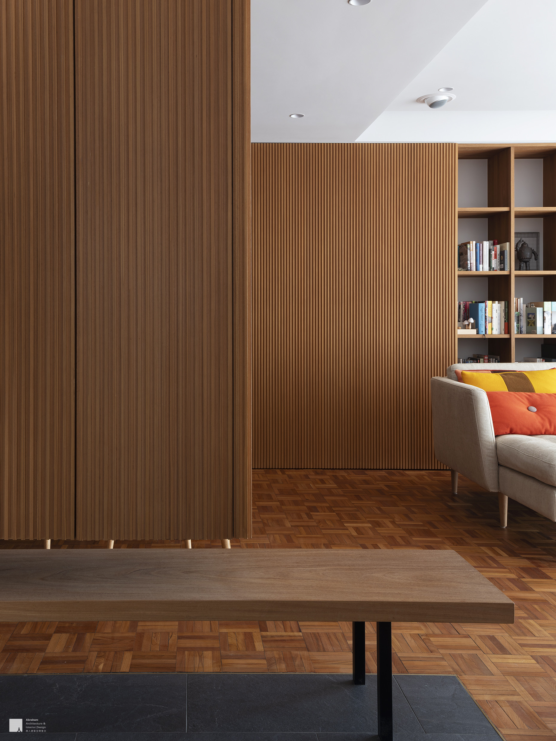 起居空間以木質元素貫穿空間,客廳與書牆交織出沉靜又溫潤的氛圍。原有的櫸木方塊地板經打磨與修補後完整延伸,成為整屋視覺與質感的基底。書牆以整面量體界定區域,中段採木格柵門片,並將主臥入口隱身其中。復古的木色搭配現代傢俱,讓人一踏入便能感受到時間與生活並存的氣息。
