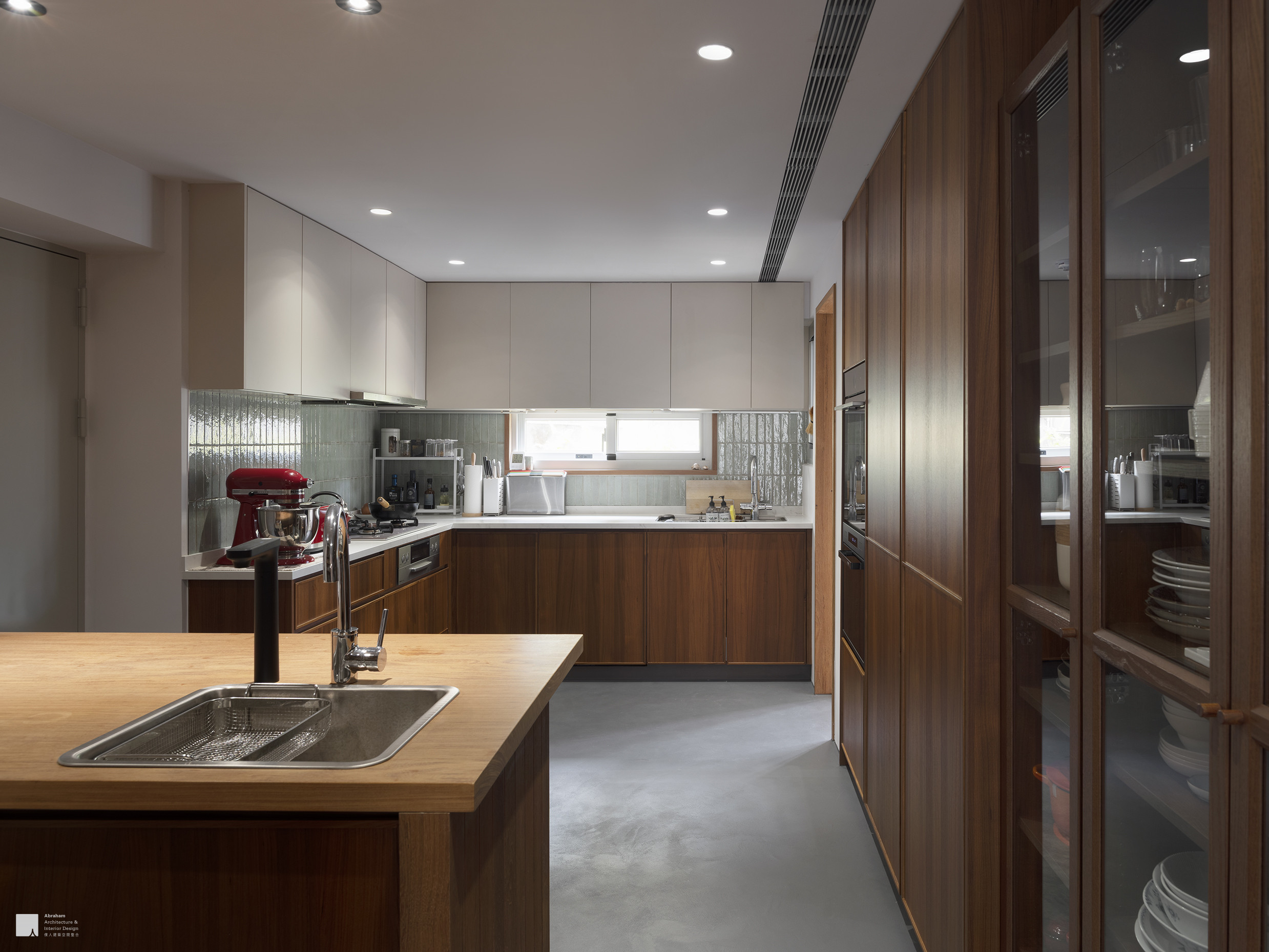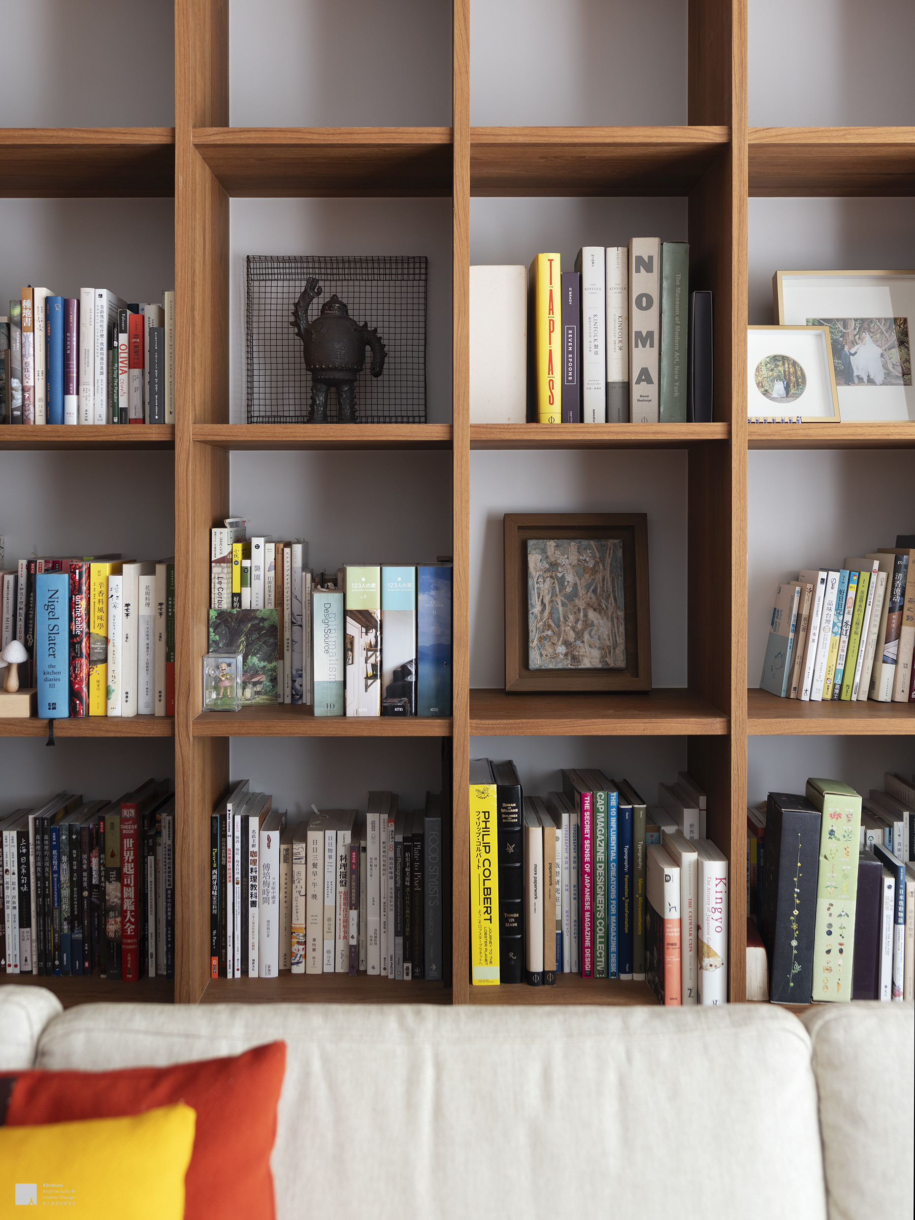 廚房專為熱愛料理的女主人而生,保留了屋主使用多年的玻璃櫃,與一旁新製木櫃自然契合。廚房以玻璃拉門在視覺通透與油煙控管間取得平衡。主臥區巧妙地隱藏在書牆後方,利用可滑動的木格柵作為入口,將公私領域自然區隔。