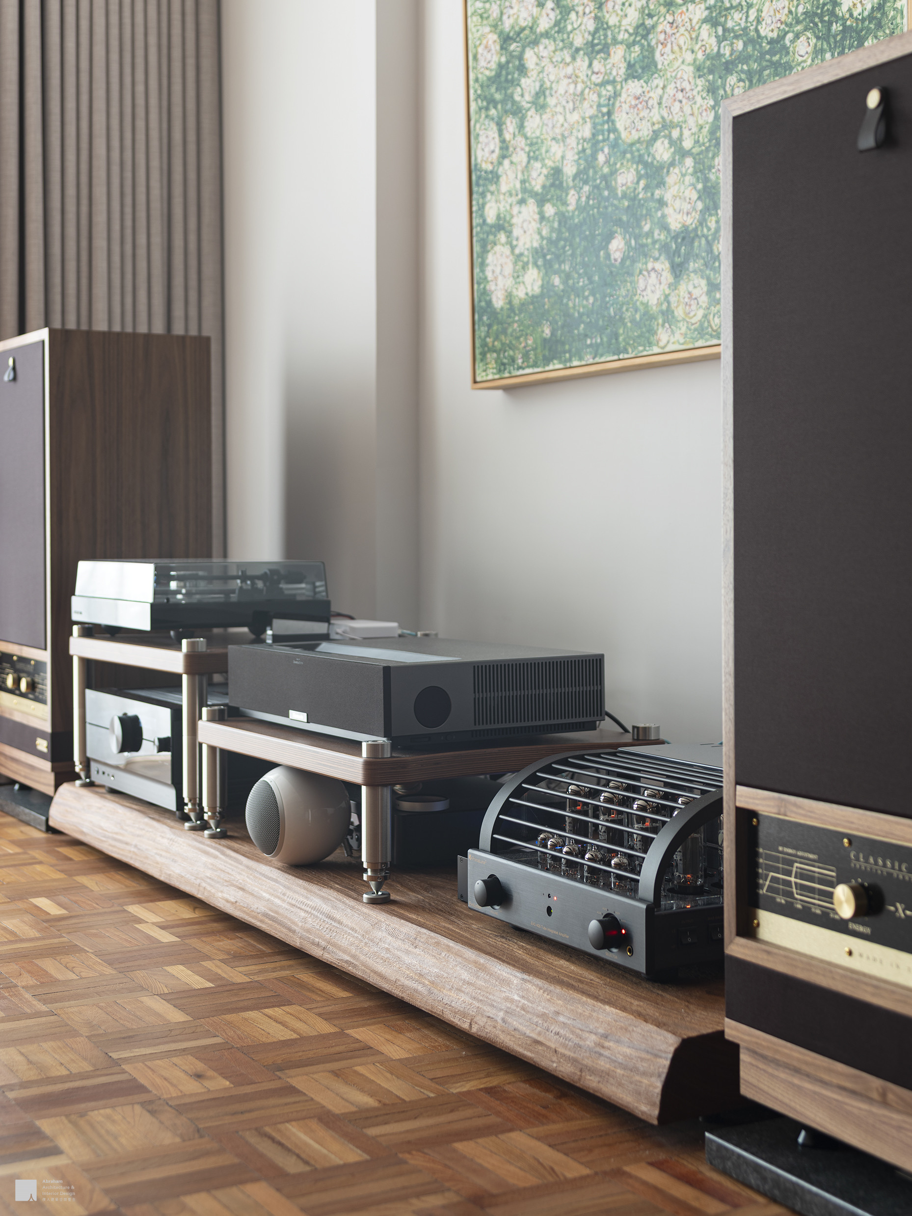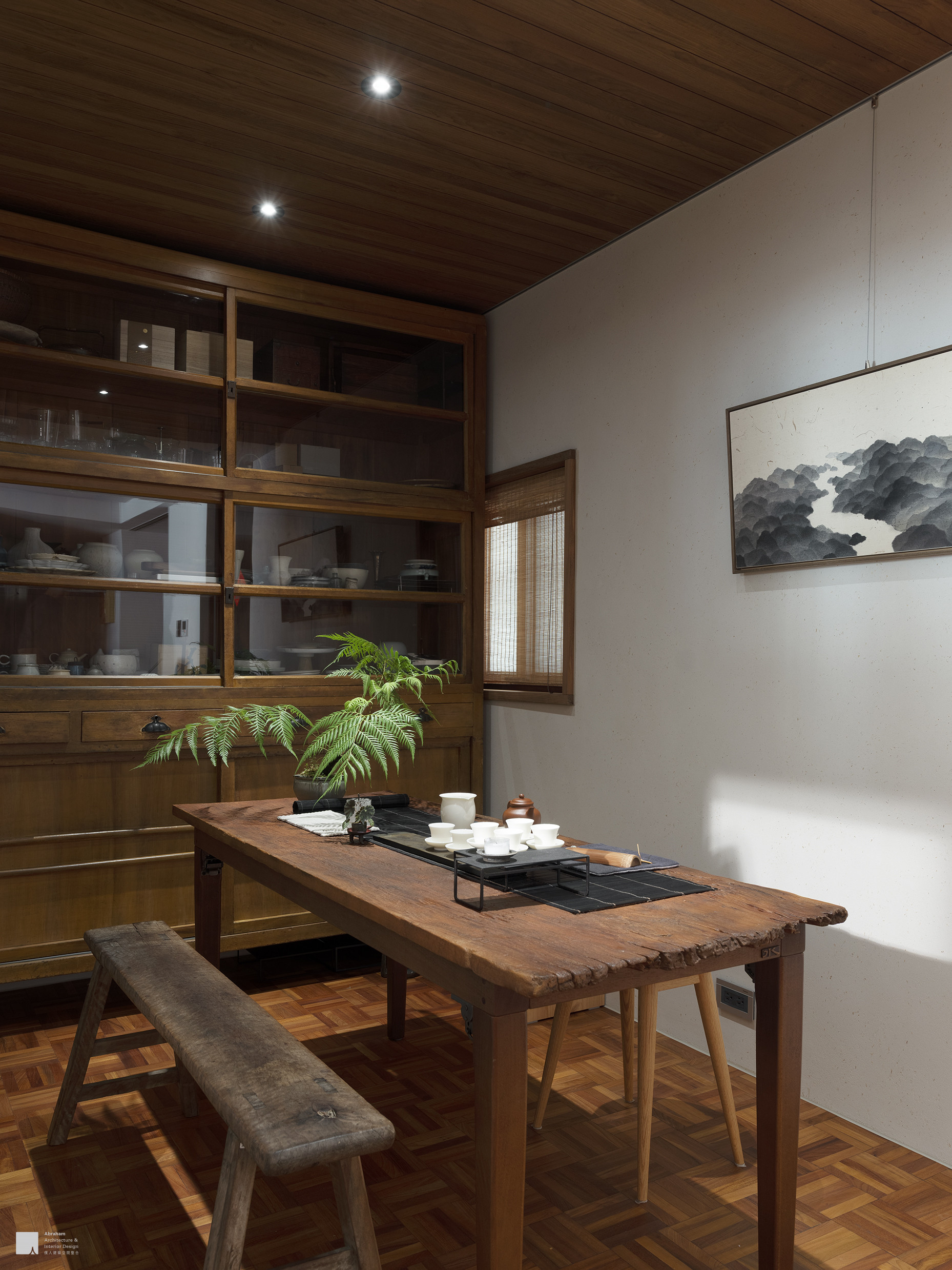 日常風景以古典風的音響設備烘托一抹「老派的浪漫」,一旁的獨立品茶區,選用老木櫃與厚實茶桌搭配成一方靜心的天地。以不做到頂的設計語彙維持量體輕盈,同時保有收納的完整性與層次,在溫潤木質調中構築迴遊的日常。